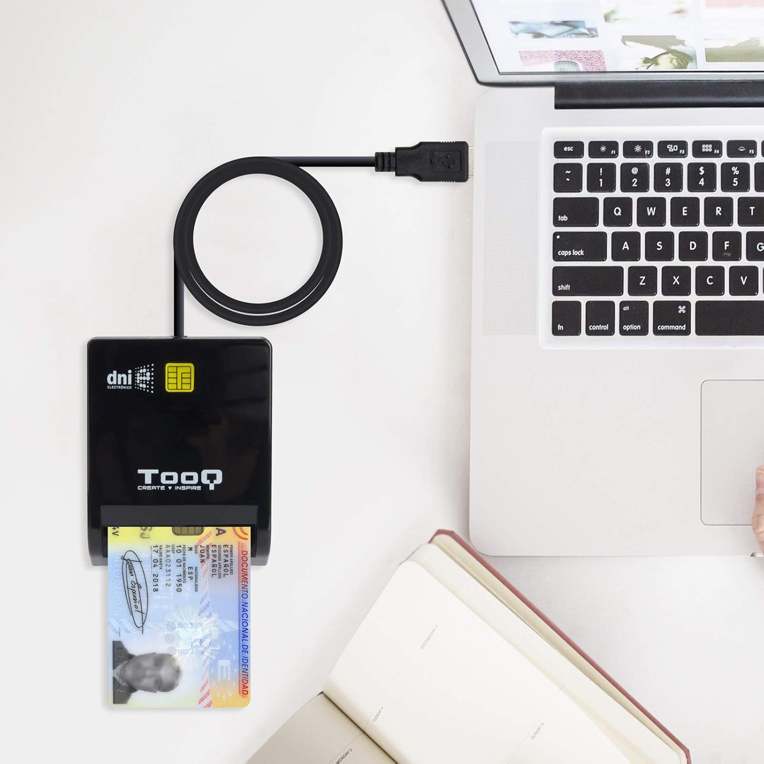 Tooq TQR-210B – kompaktne USB-ühendusega ID-kaardi ja DNI-e lugeja, mis võimaldab turvalist digitaalset tuvastamist, elektroonilist allkirjastamist ja e-teenuste kasutamist laua- või sülearvutis.