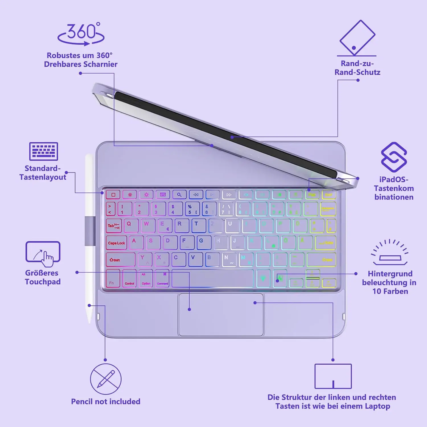 See TQQ klaviatuurikorpus 10. ja 11. põlvkonna iPadile pakub 360° pööratavat disaini, täpset puuteplaati ja 7-värvilise taustavalgustusega klaviatuuri, muutes tahvelarvuti sülearvuti sarnaseks tööjaamaks.