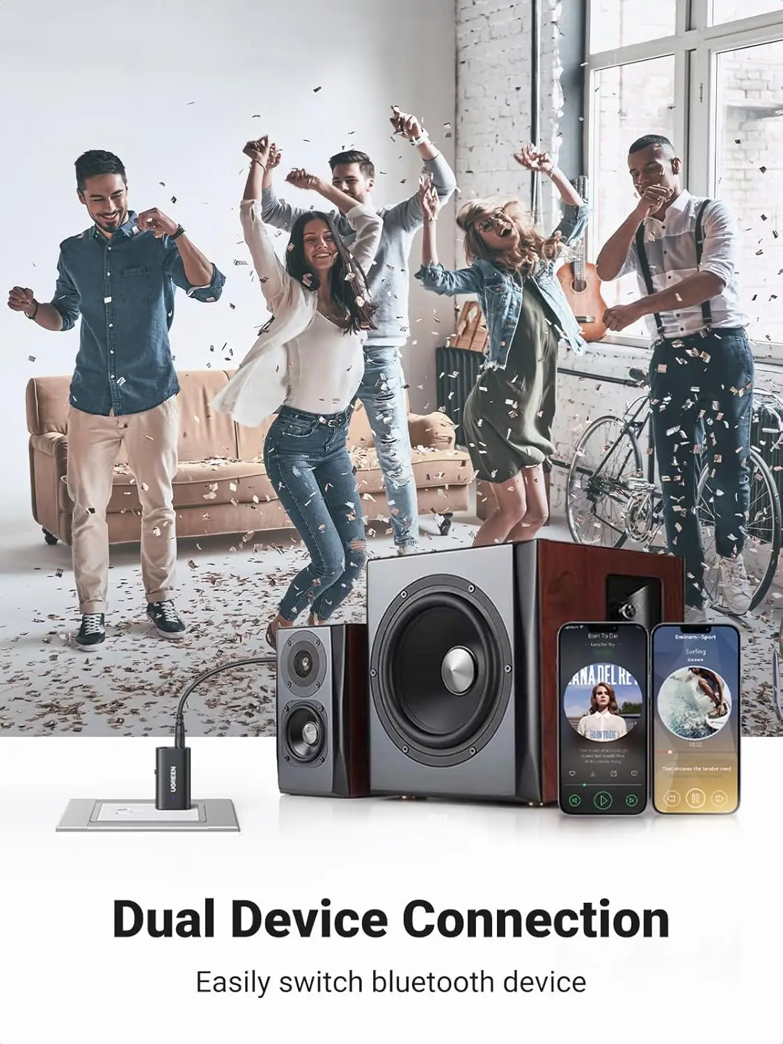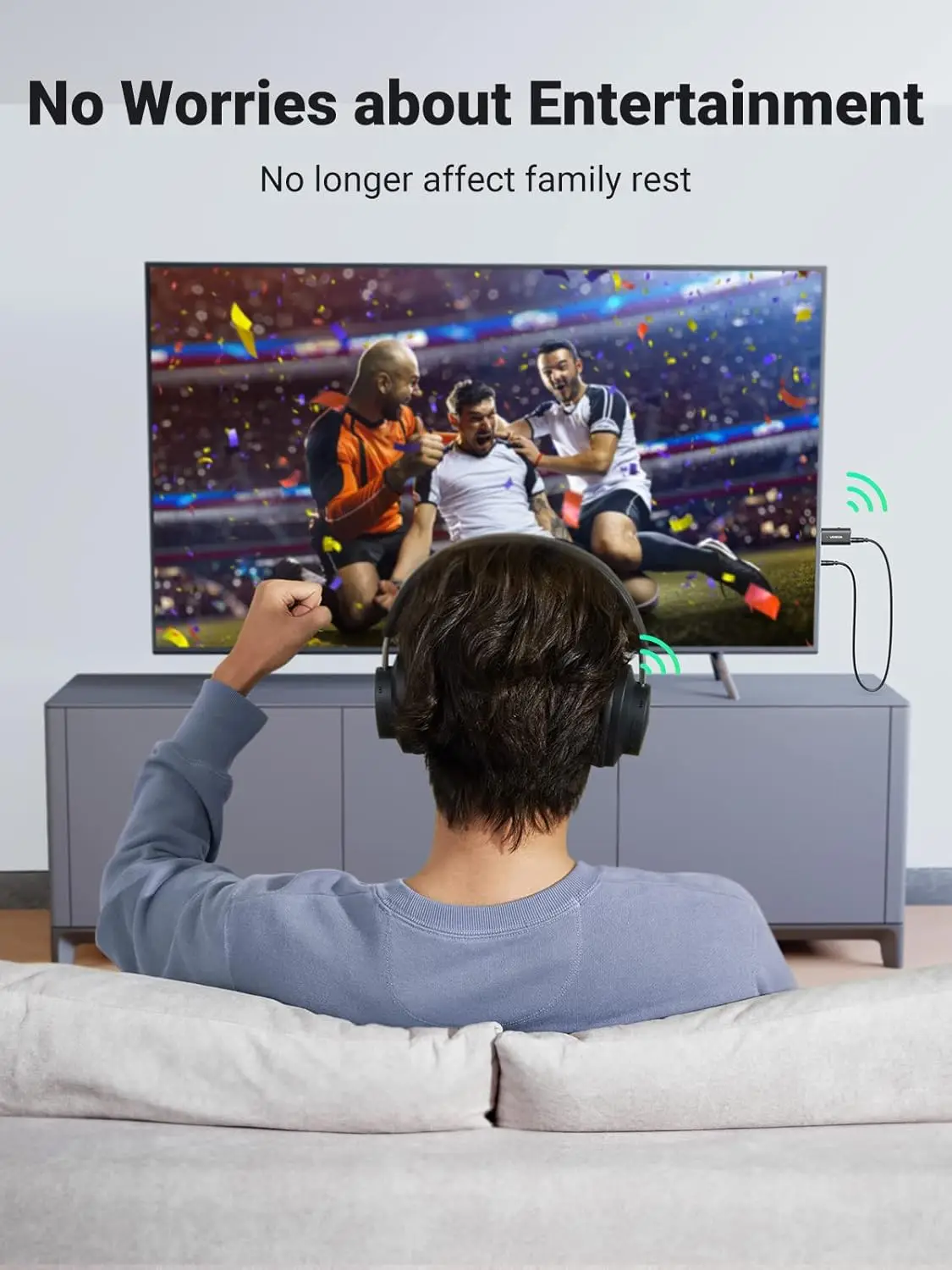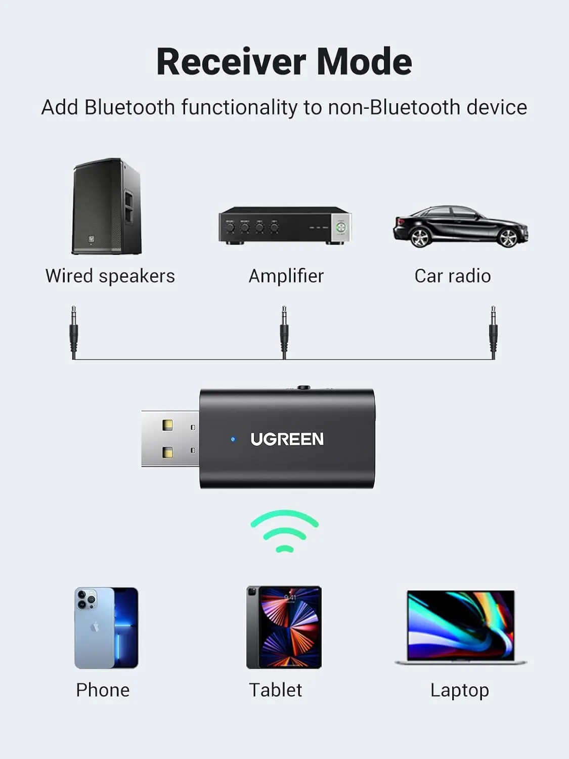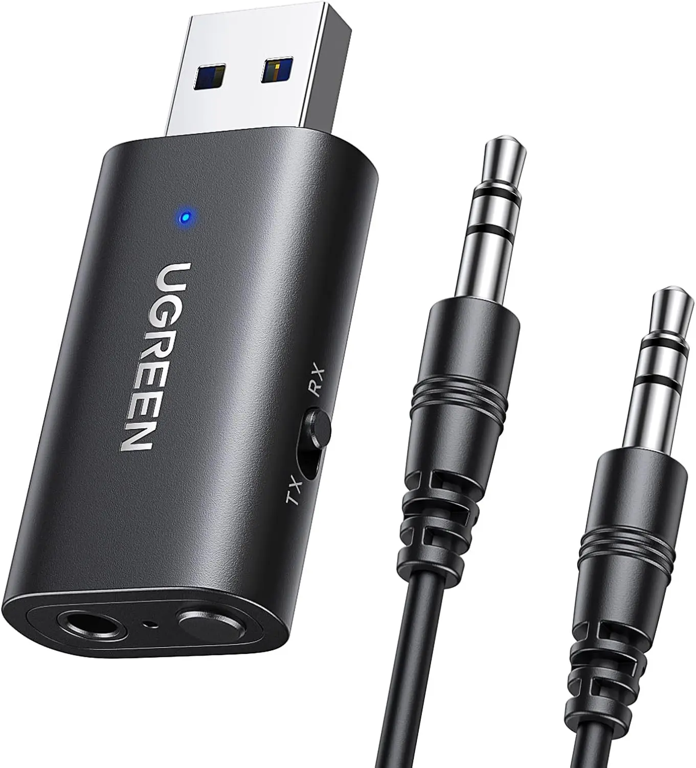 UGREEN Bluetooth 5.4 Adapter (2-in-1) – a versatile 3.5mm AUX transmitter and receiver featuring the latest Bluetooth 5.4 technology for seamless wireless connectivity between TVs, headphones, and stereo systems.