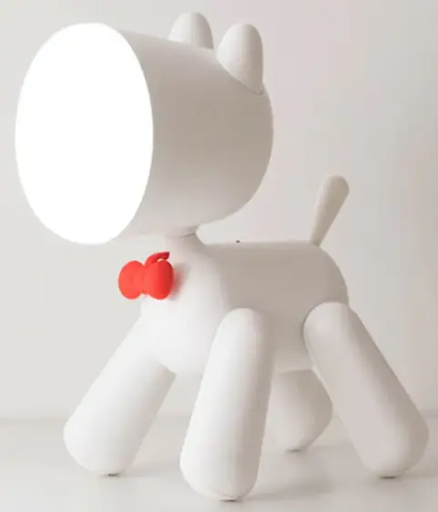 Waggy Puppy Table Lamp – adorable white puppy-shaped night light with a tail switch and Micro-USB charging port, featuring adjustable brightness and eye-care LED technology, energy-saving design perfect for bedrooms or living rooms.