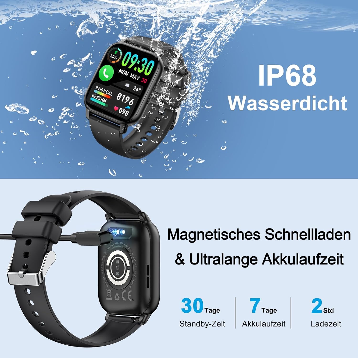 1.85" HD Smartwatch – large-display smartwatch with phone calling, featuring 112+ sports modes, heart rate and sleep monitoring, IP68 waterproof rating, and information reminders for iOS and Android users.