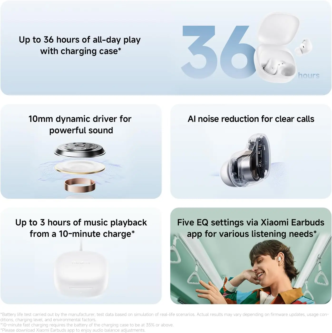 Xiaomi Redmi Buds 6 Play (Blue) – compact True Wireless earbuds featuring 10mm dynamic drivers, up to 36 hours of total battery life, and AI-powered noise reduction for clear calls.